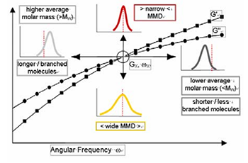 究模量交叉點 Gx 的水平位置可以定性分析平均分子量,Gx 的垂直位置說明了分子量分布MMD。另外,比較同類聚合物,支化程度也和Gx 的水平偏移有關。