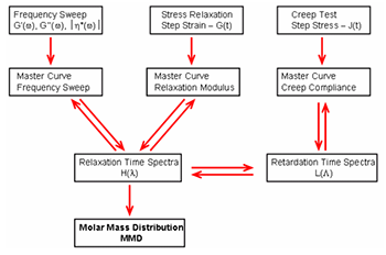 通過不同溫度下的頻率掃描,應力松弛和、蠕變實驗,可以計算主曲線, 從而計算松弛時間譜;對于已知材料參數(shù)的聚合物(如 PS, PE, PP,