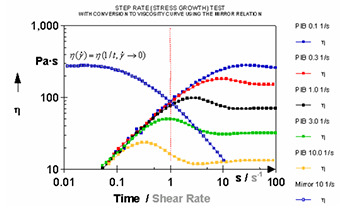 應力階梯變化(蠕變及回復)、應變階梯變化(應力松弛)、速率階梯變化(應力增加/開始流動)可以測量材料對于給定剪切應力、剪切應變或剪切速率的時間(瞬時)響應。分析方法包括計算一些重要的材料參數(shù),如零剪切粘度、平臺模量、蠕變?nèi)崃亢蛯⑺矐B(tài)材料函數(shù)轉(zhuǎn)換為動態(tài)材料函數(shù)- G’(ω)G”(ω)。圖六中,提供了應力增加測試實例。