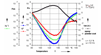 圖 9 為熱固性的環(huán)氧樹脂隨溫度的變化性能。通過流變學參數(shù)如模量或粘度隨溫度變化的曲線,我們可以很方便地判斷環(huán)氧樹脂的熔融溫度,凝膠化溫度和固化過程。若在恒定的熔融溫度下,跟蹤環(huán)氧樹脂的模量或粘度隨時間變化的曲線,我們可以得到固化時間和固化動力學的信息。