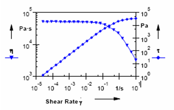 聚合物的流動曲線一般以第一牛頓平臺區(qū)的低剪切速率下的粘度作為零剪切粘度,隨剪切速率增大,粘度會下降,產(chǎn)生一個轉(zhuǎn)變區(qū)間。在高的剪切速率下,粘度曲線的斜率即粘度對剪切速率的曲線斜率是恒定的,即符合所謂的冪律方程。在更高的剪切速率下,粘度又會出現(xiàn)第二牛頓平臺區(qū)。然而,實現(xiàn)真正應變控制的旋轉(zhuǎn)流變儀大多數(shù)情況下可以做到第一牛頓平臺區(qū),轉(zhuǎn)變區(qū)和冪律區(qū)。