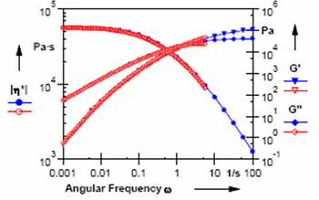 假如在零剪切粘度區(qū)域存儲模量的曲線斜率不等于 2,原因可能是因為聚合物交聯(lián)或在氧氣和熱作用下降解或濕度敏感。