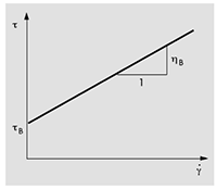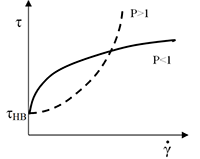 塑性流動(plastic flow)的流動曲線如圖 14-7(b)所示,曲線不經(jīng)過原點,在剪切應(yīng)力 τ軸上的某處有交點,將曲線外延至=0,在 τ 軸上某一點可以屈服值(yield value)。當(dāng)剪切應(yīng)力達不到屈服值以上時,液體在剪切應(yīng)力作用下不發(fā)生流動,而表現(xiàn)為彈性變形。當(dāng)剪切應(yīng)力增加至屈服值時,液體開始流動,剪切速率和剪切應(yīng)力 τ 呈直線關(guān)系。液體的這種變形稱為塑性流動。引起液體流動的最低剪切應(yīng)力為屈服值 τ0。