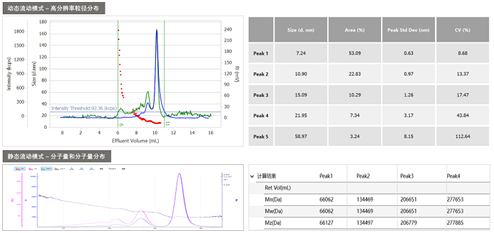 BeNano動(dòng)靜態(tài)流動(dòng)模式(Flow Mode)是將納米粒度及Zeta電位儀同一個(gè)分離前端(FFF、GPC/SEC)相連接。分離前端可以根據(jù)尺寸將樣品進(jìn)行分離,依次流出。通過(guò)檢測(cè)每個(gè)流出組分的動(dòng)態(tài)光散射信號(hào)和靜態(tài)光散射號(hào),并結(jié)合分離前端的示差折光RI或者紫外UV信號(hào),得到高分辨率且不依賴(lài)于計(jì)算模型的粒徑分布、分子量分布信息。