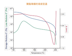 右圖是使用拉伸夾具對(duì)50微米厚的PET薄膜在50-250℃間進(jìn)行的變溫振蕩測(cè)試??梢悦黠@觀測(cè)到兩個(gè)主要轉(zhuǎn)變:玻璃化轉(zhuǎn)變?cè)诖蠹s109℃;熔融溫度在234℃。在玻璃化轉(zhuǎn)變,長(zhǎng)度的明顯表明樣品有顯著的收縮。